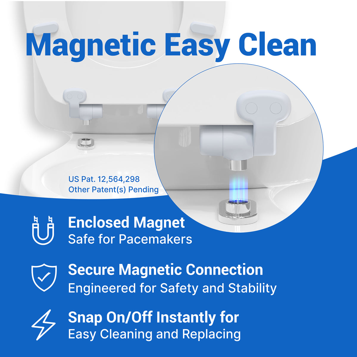 The Magic Hinge connects the toilet seat to the toilet bowl magnetically for easy removal and reattachment with a snap. This allows for more thorough cleaning of both the seat and the toilet bowl.