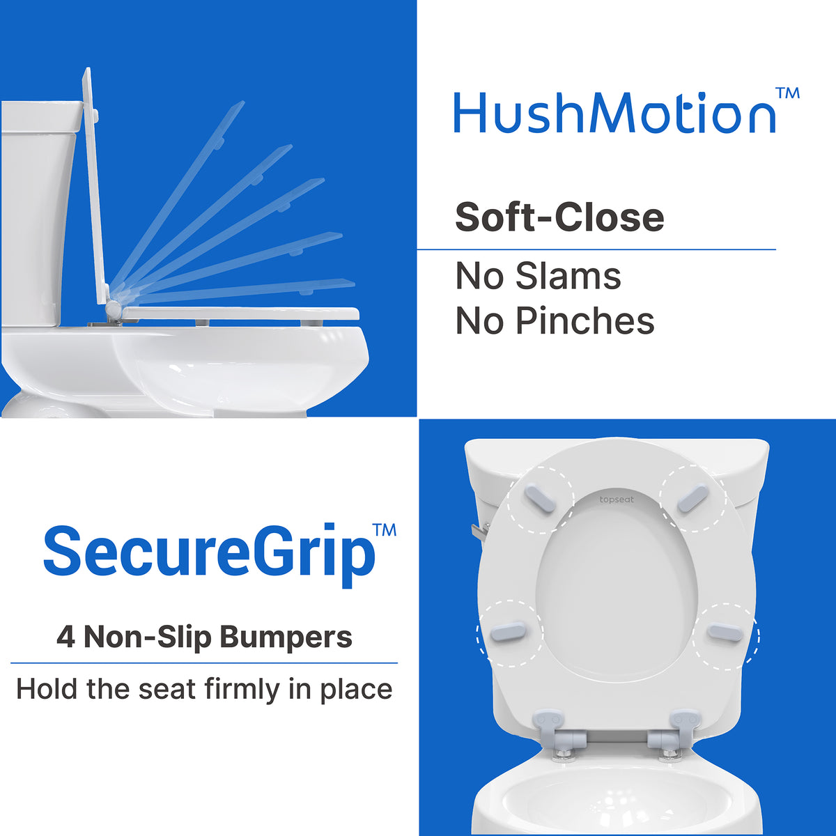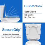 The HushMotion slow-close Technology mechanism allows the toilet seat to close gradually and quietly, preventing slamming and pinching.